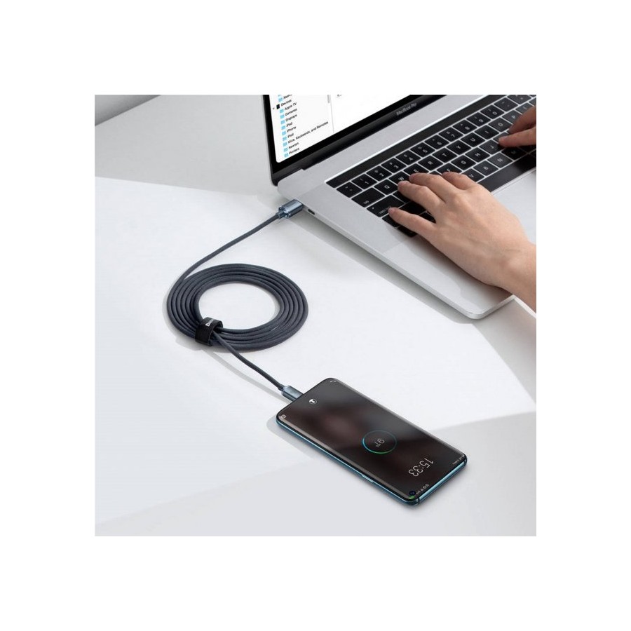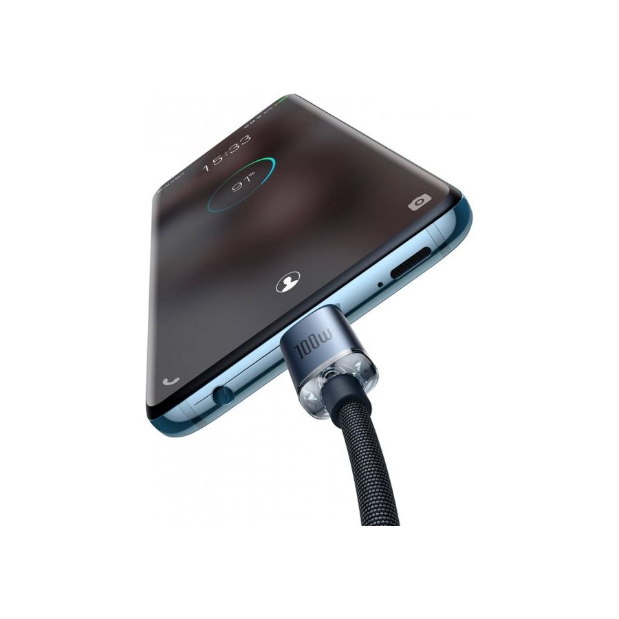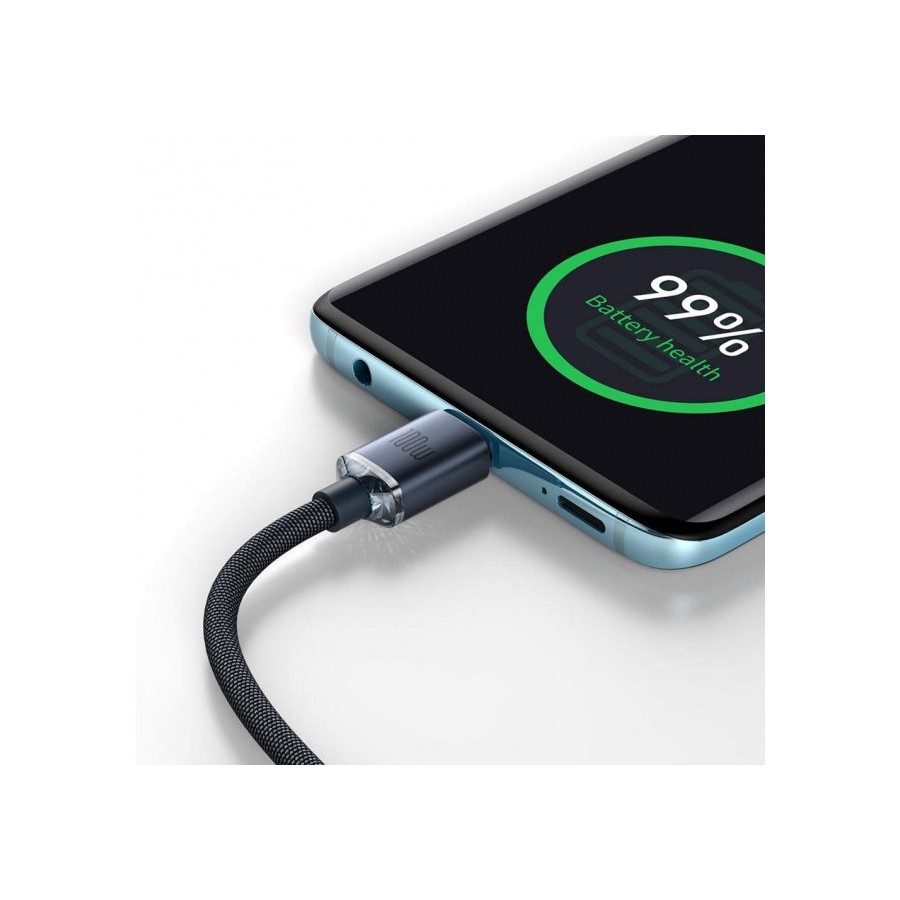 Обплетений кабель Baseus USB Type C — USB Type C серії Crystal Shine із міцною текстурою має додаткове підсилення в місці з'єднання штекера з кабелем. Тому він стійкий до згинів та розтягування. Всередині міститься 8-жильний мідний кабель, що завдяки інтелектуальному чіпу не нагріватиметься навіть під час одночасного наснаження та передачі даних.