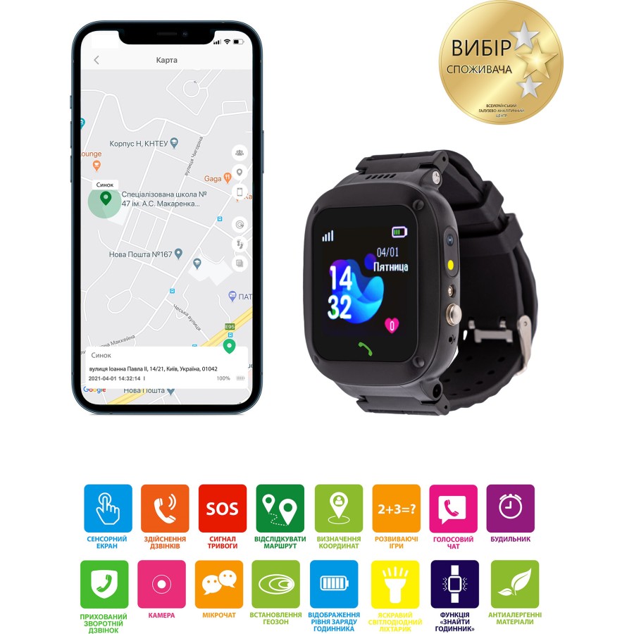 Смарт-годинник AmiGo GO004 Splashproof Camera + LED працюють у форматі «маячок для дітей» і дозволяють батькам завжди проконтролювати де знаходиться їх малюк. Бездротова модель з підтримкою Bluetooth v 4.0 легко синхронізується з мобільним пристроєм і працює на пристойній відстані від нього, дозволяючи отримувати оповіщення про вхідні дзвінки та SMS-повідомлення. Браслет з підтримкою власної micro-SIM дозволяє здійснювати особисті дзвінки, в тому числі і екстрені.
