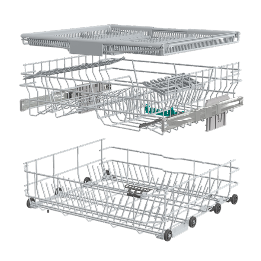 Ретельно розроблені внутрішні відділення. Кошики приборів мають помітні рухливі компоненти та змінну яскравість, що потребує простого завантаження. Дійсно трирівнева система встановлення кошиків дає можливість розмістити навіть найбільші каструлі та тарілки. Полиці нижніх кошиків можуть складатися, щоб отримати більше місце для великих гравців. Столові прибори можна розмістити у спеціальних лотах. Вони витрачаються окремо, щоб не подряпалися і добре висохли. Виробники приділили увагу кожній деталі, щоб максимально швидко доставити миття посуду.