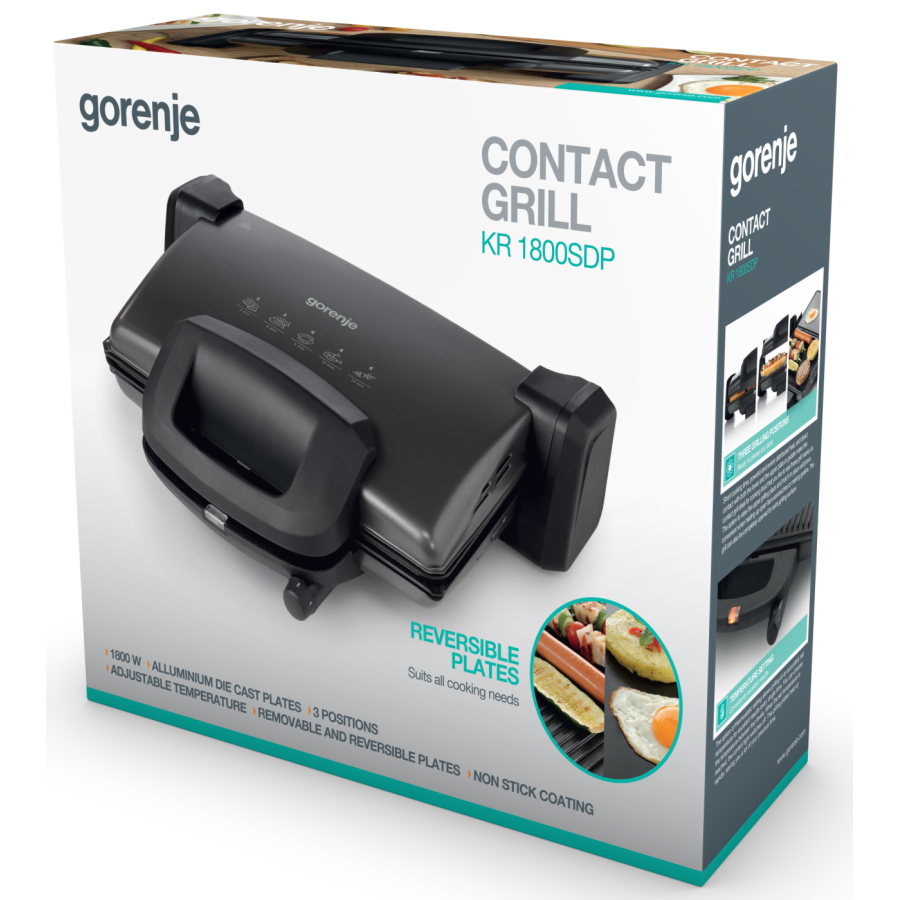 Гриль KR 1800 SDP від компанії GORENJE потужністю 1800 Вт не займає багато місця на кухні та підходить для приготування різних страв. Прилад оснащений антипригарними пластинами, завдяки чому страви не пригорять.
