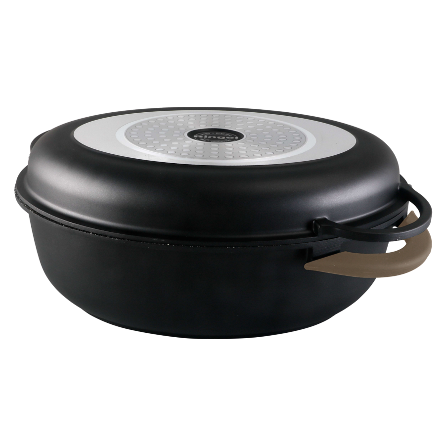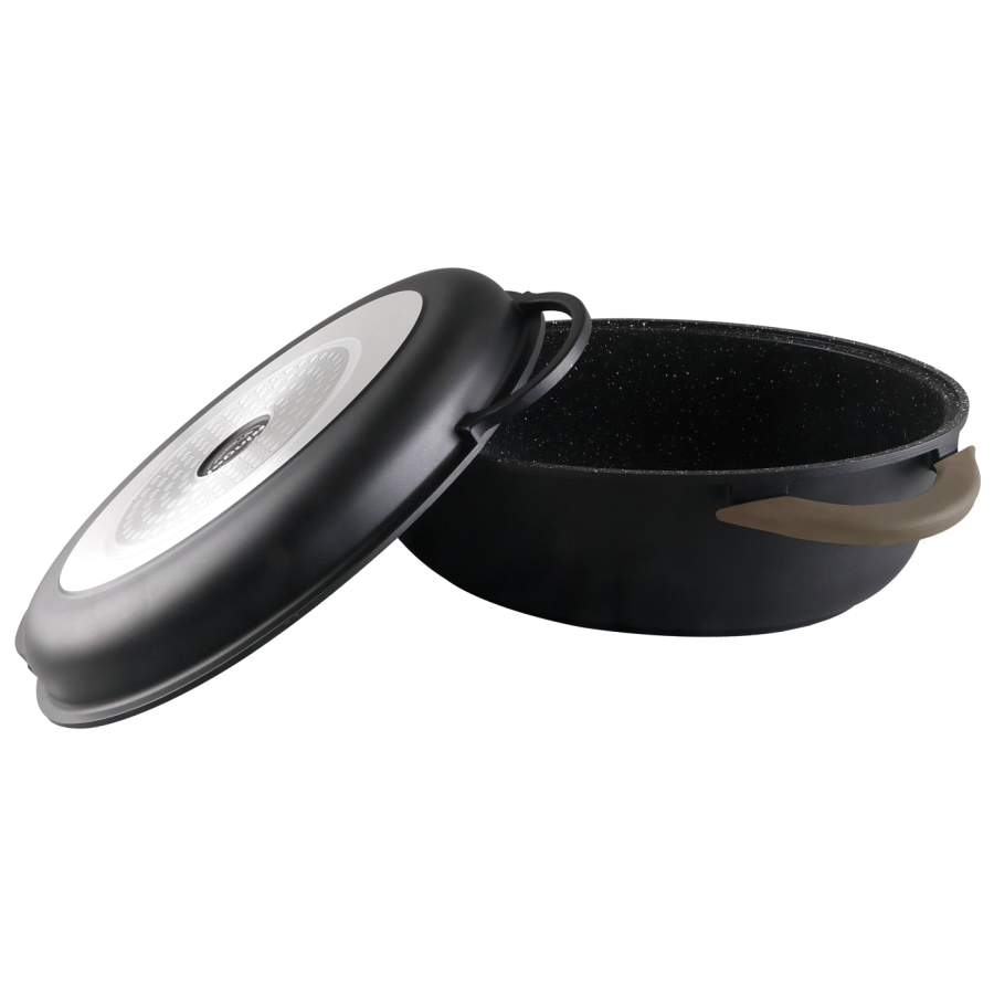 - Високоякісний литий алюміній товщиною 4 мм рівномірно розподіляє тепло по дну та поверхні і швидко передає його страві
