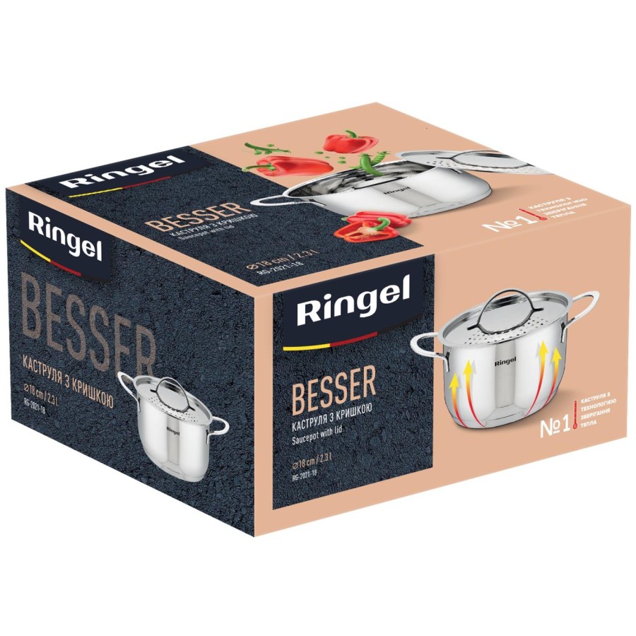 Усі каструлі RINGEL вироблені за найновітнішою технологією зберігання тепла. Потовщене капсульне дно швидко та рівномірно передає тепло страві, що дозволяє скоротити час на приготування та зберегти максимум корисних речовин у стравах, а потовщені стінки каструль RINGEL забезпечують максимально довге утримання страви теплою, без необхідності додаткового розігрівання.