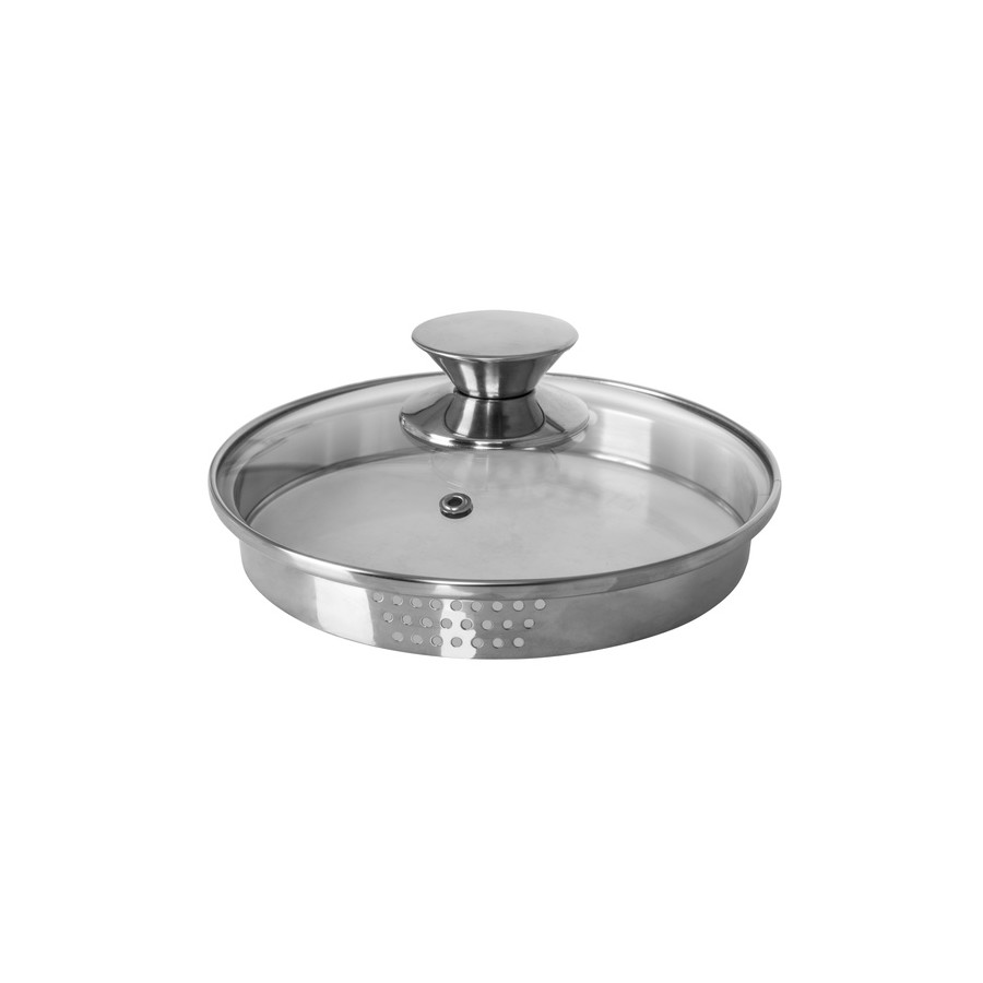 До переваг, також можна віднести функціональну кришку, яка оснащена отвором для випускання пари і металевим широким обідком з отворами для зливу рідини.