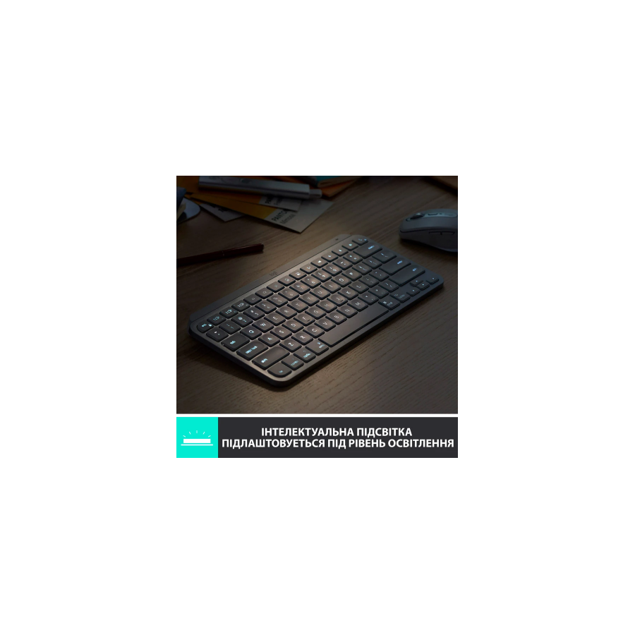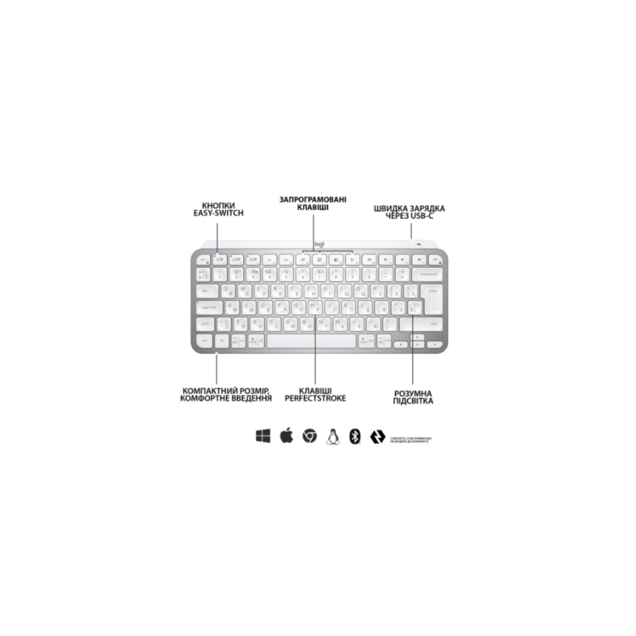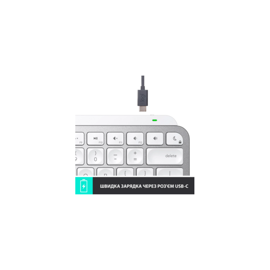MX Keys Mini працює до 10 днів після повної зарядки або до 5 місяців із вимкненим підсвічуванням. Використовуйте зарядний кабель USB-C, щоб поповнити заряд.