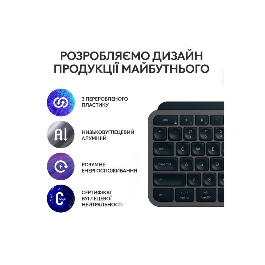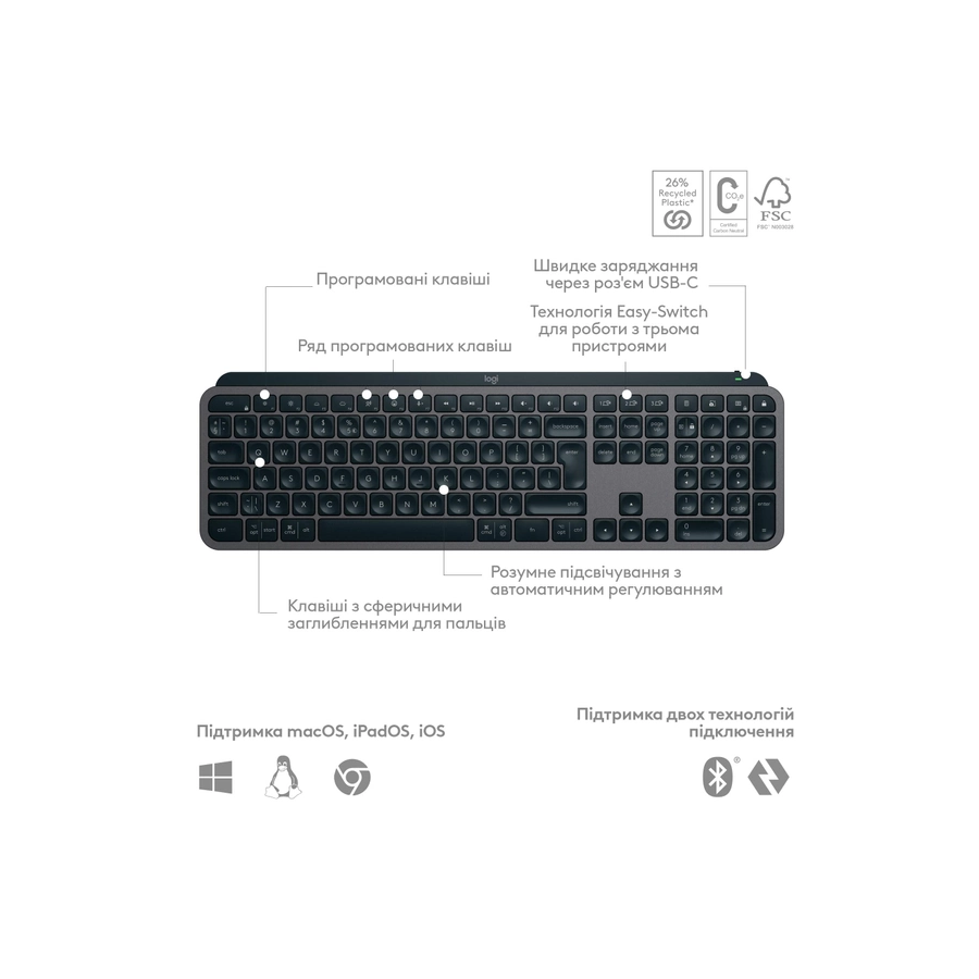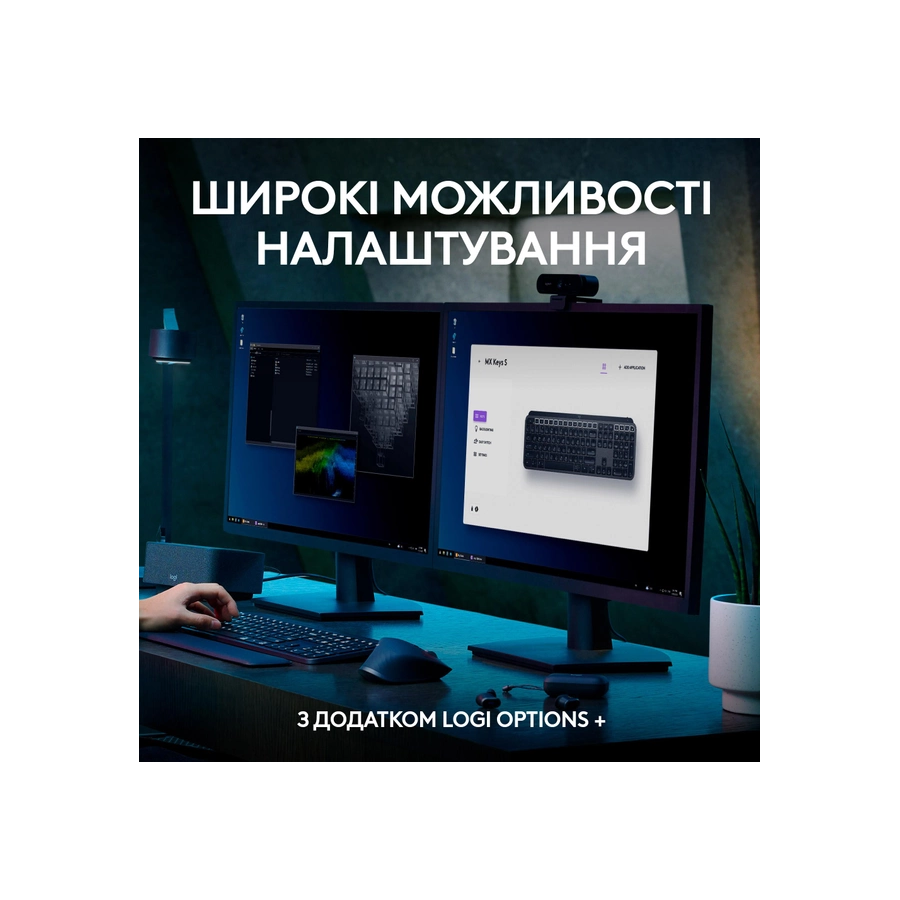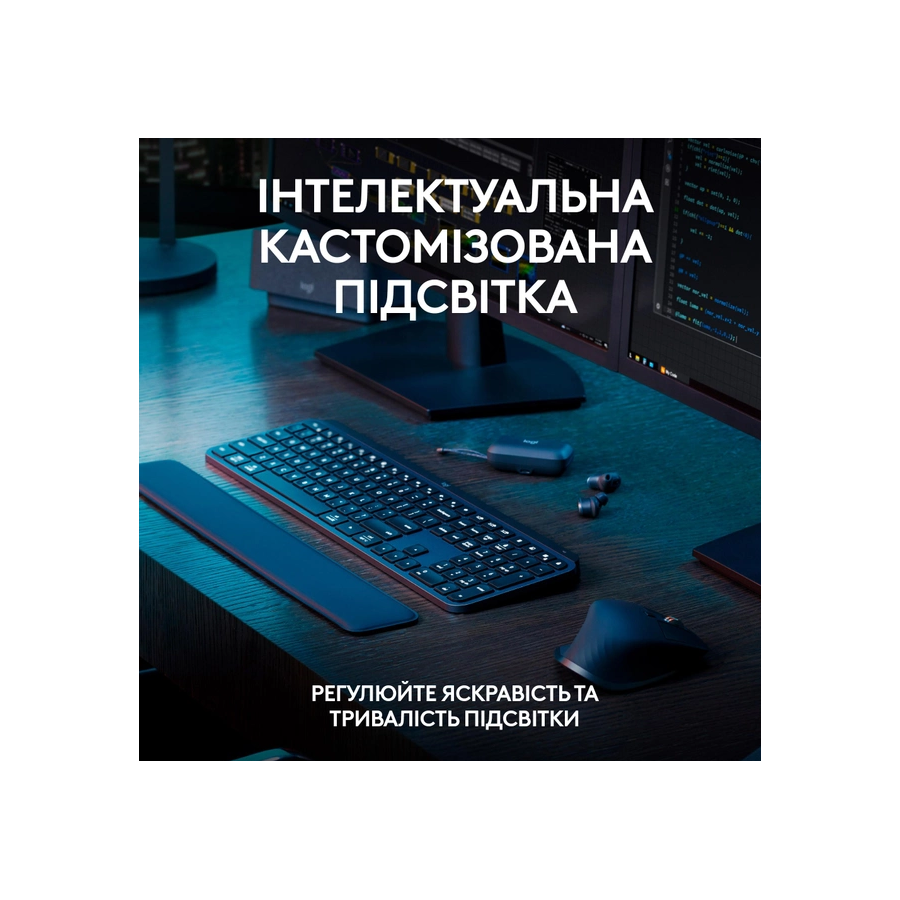 Клавіші підсвічуються, коли руки наближаються до клавіатури та адаптуються до оточення; тепер з більшим вибором настройок підсвічування на Logi Options+.