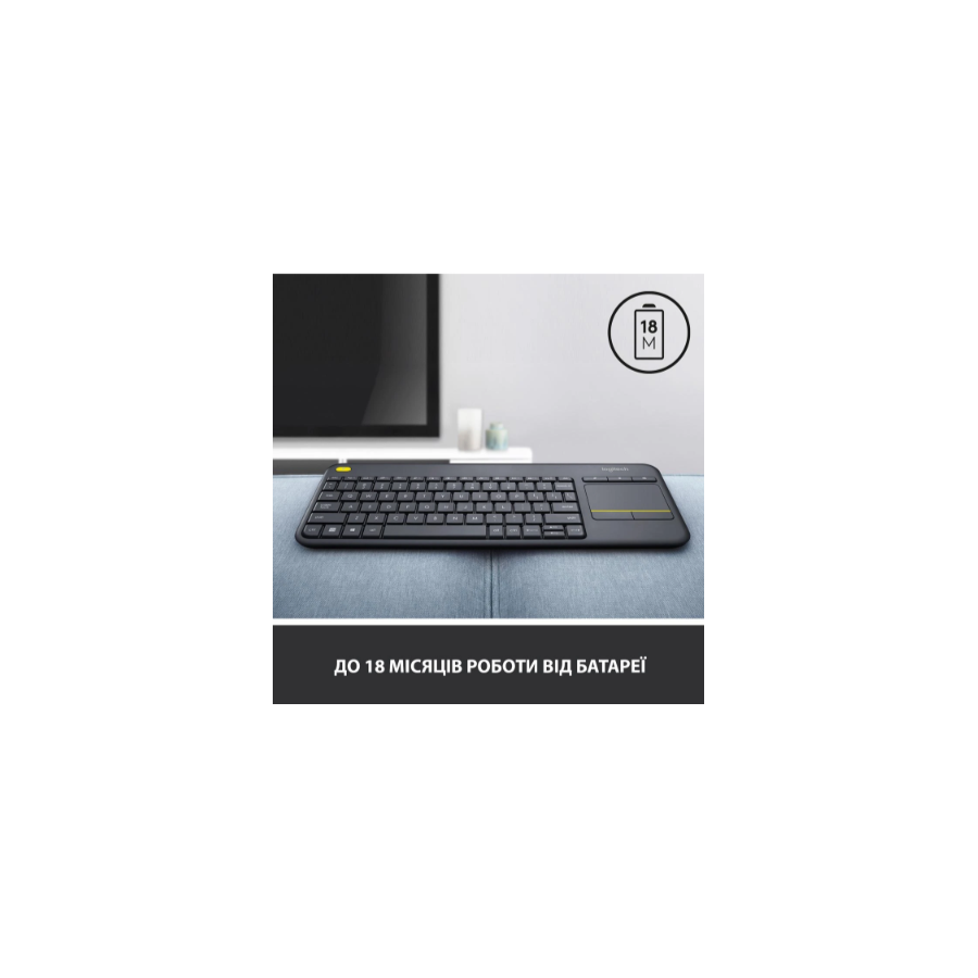 Бездротова клавіатура Plug and Play із вбудованою сенсорною панеллю для повного керування комп’ютером, під'єднаним до телевізора, з дивана. K400 — це тиха, проста у використанні клавіатура з вбудованою сенсорною панеллю, а також усіма гарячими клавішами, які знають і люблять користувачі Windows® і Android™. У комплекті з елементами керування медіафайлами, які спрощують навігацію телевізором, керованим ПК.
