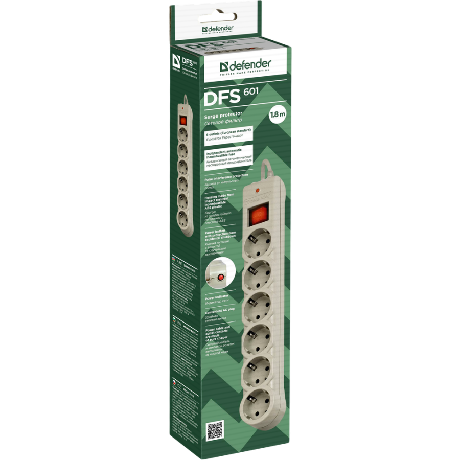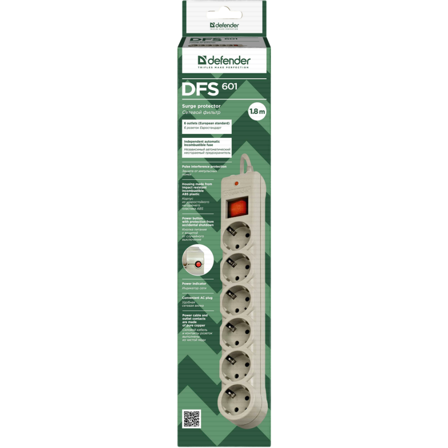 Мережевий фільтр живлення Defender DEFENDER DFS 601 1.8m 6 роз. (99406) - пристрій початкового рівня, економічний варіант вирішення проблеми захисту електроживлення. Призначений для під'єднання комп'ютерної периферії, широкого спектра побутової та електронної техніки, включаючи чайники і електронагрівачі.