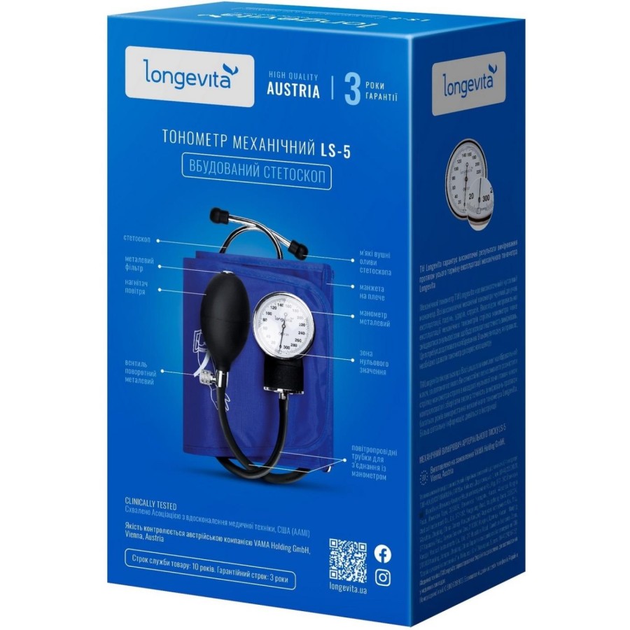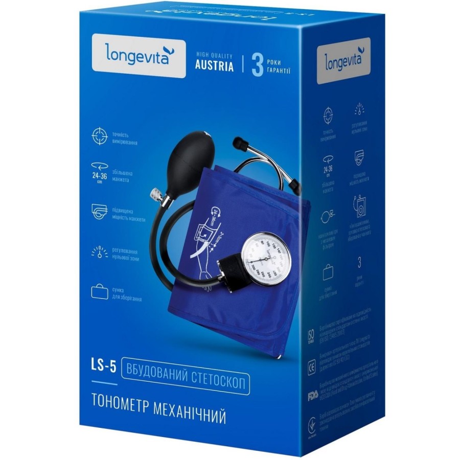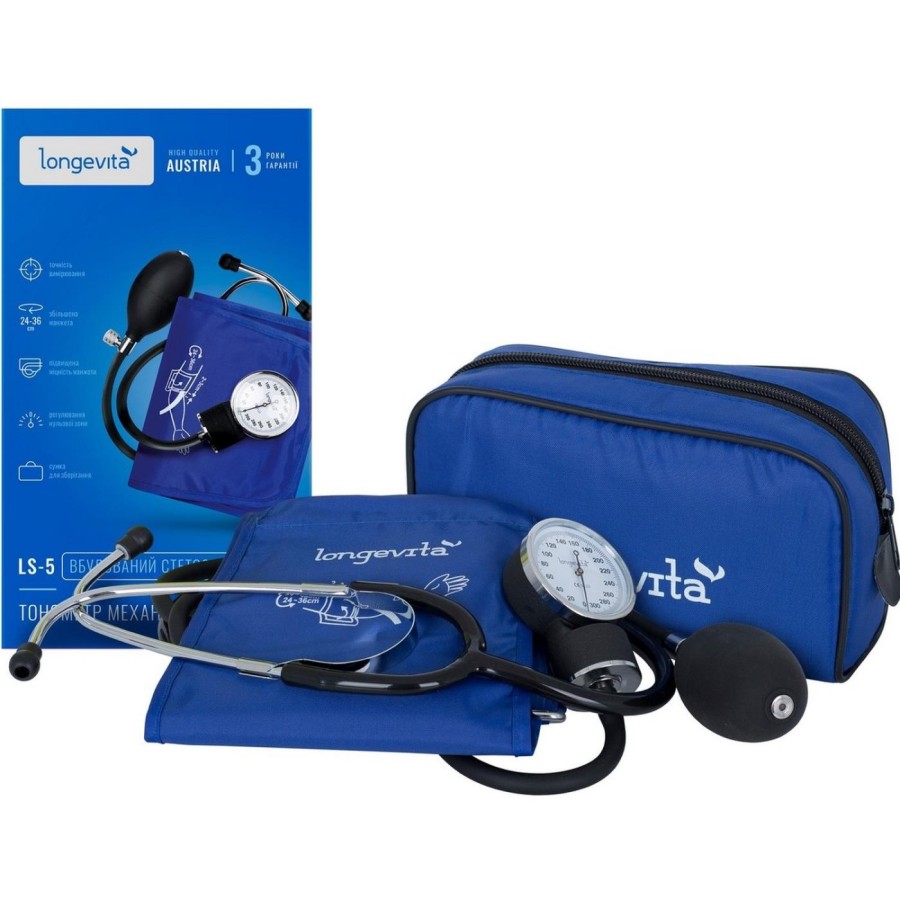 Механічний тонометр Longevita LS-5 – надійний і точний прилад для вимірювання тиску, поставляється зі стетоскопом, вбудованим в манжету.
