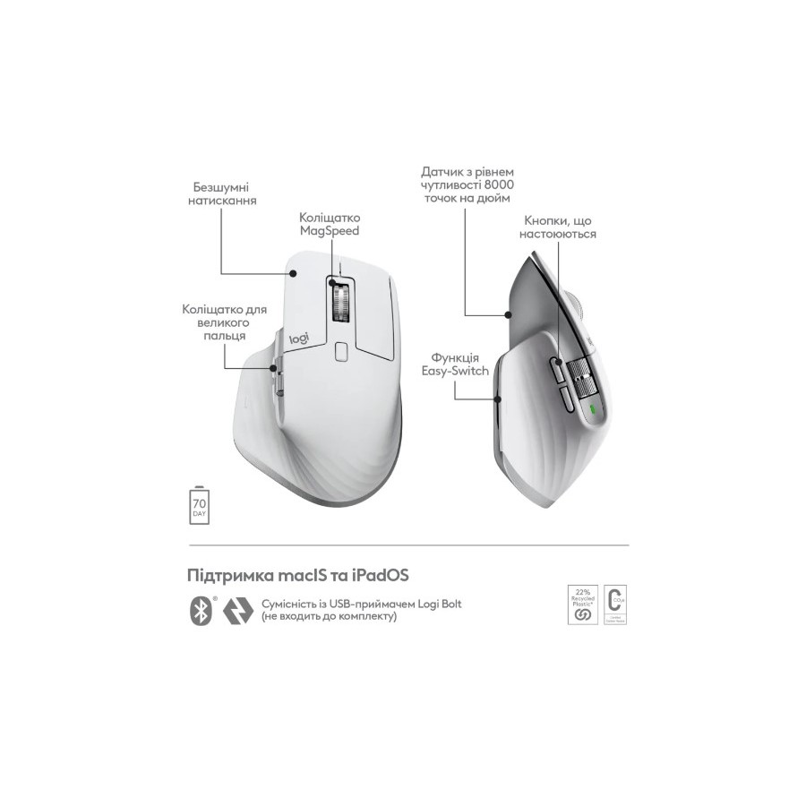 MX Master 3S для Mac працює до 70 днів без підзарядки при повному заряді - і отримує три години роботи від однієї хвилини швидкого заряду.