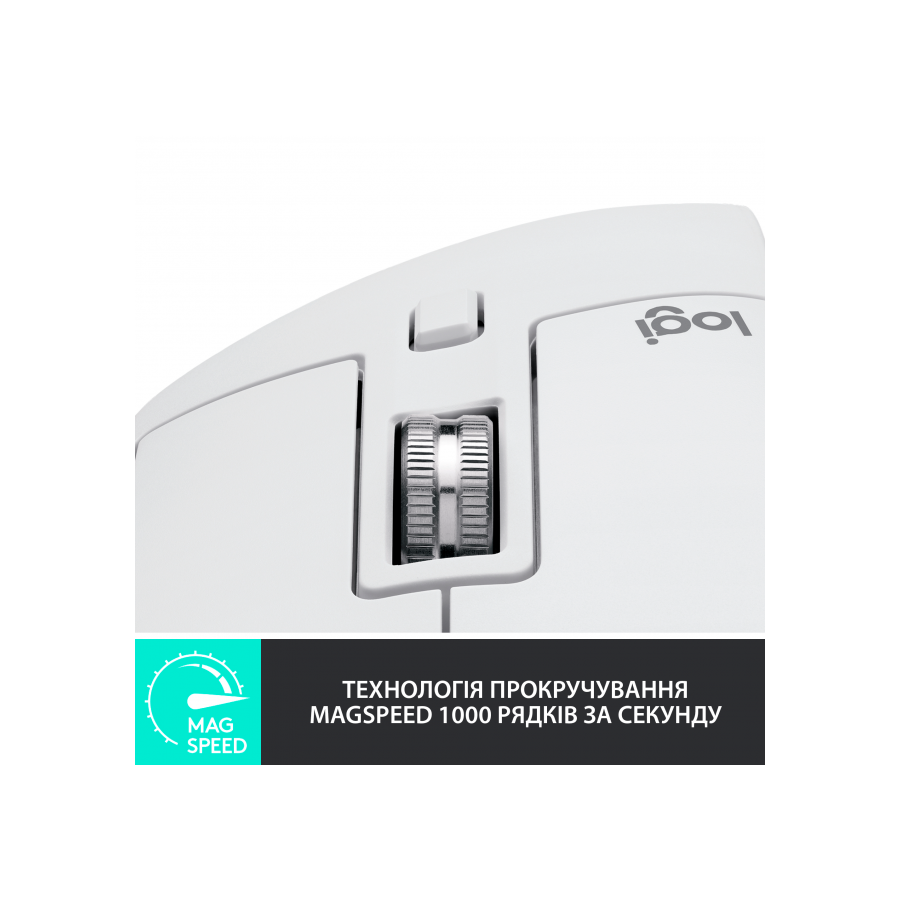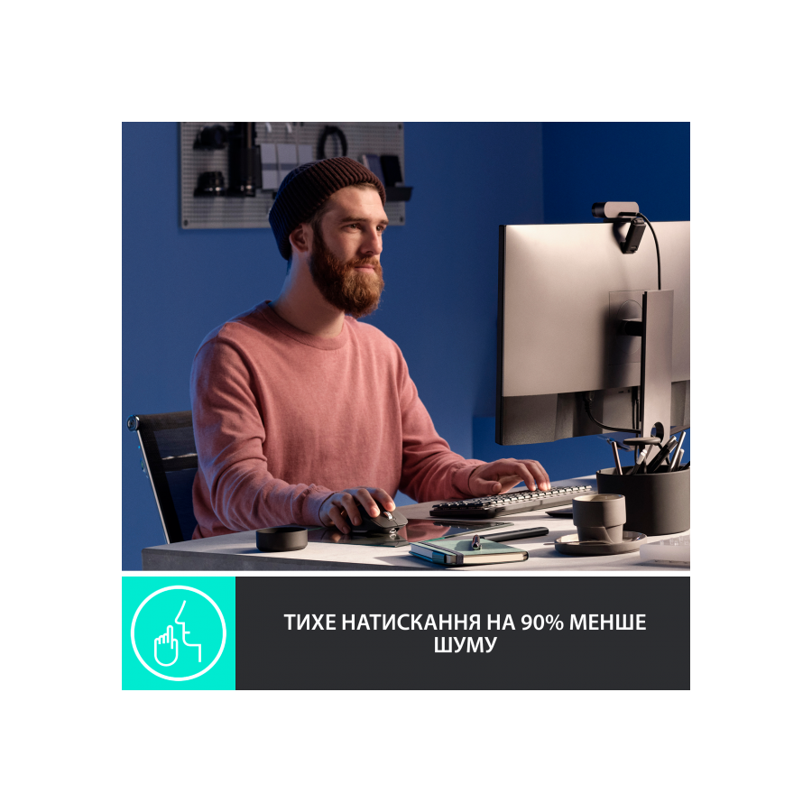 Представляємо Quiet Clicks – технологію практично безшумної тактильної віддачі для роботи та творчості. Кнопки Quiet Clicks забезпечують приємне тактильне відчуття при натисканні, але звучать на 90% тихіше за звичайні. (У порівнянні з MX Master 3 рівень звукової потужності при клацанні лівою та правою кнопкою миші MX Master 3S на 90% нижче (при вимірюванні на відстані 1 м).).