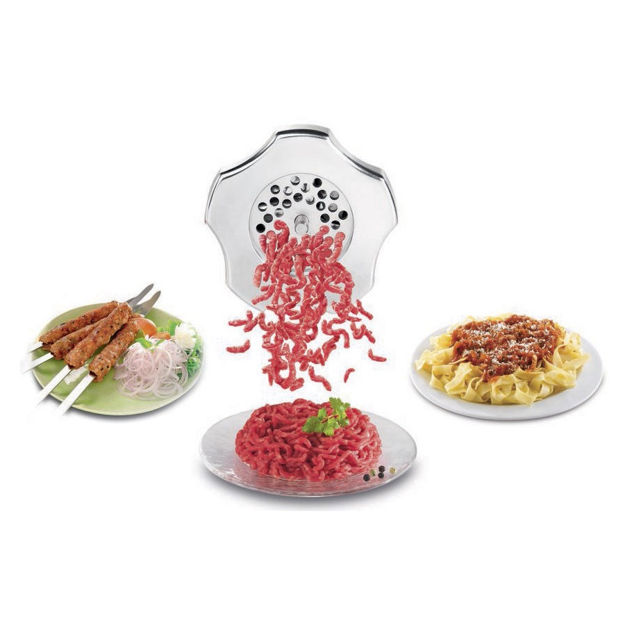 У комплект входять 3 різні решітки для м'яса (для дрібного, середнього та крупного помелу), 4 барабани для терки/шинкування, барабан для нарізки кубиків, насадки для кебе та ковбас.