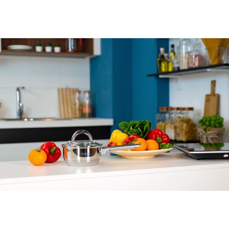 Мірна шкала на внутрішній стороні стінок каструль і ковша допомагає точніше дотримуватися пропорції сухих у рідких інгредієнтів.