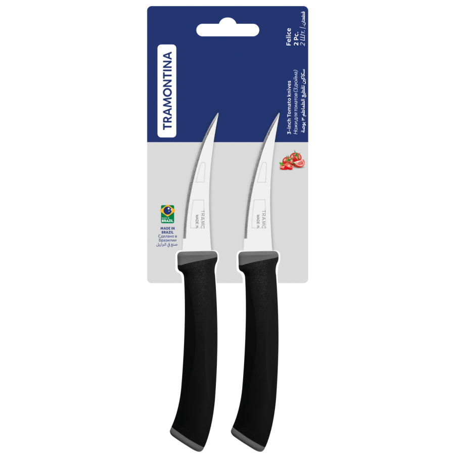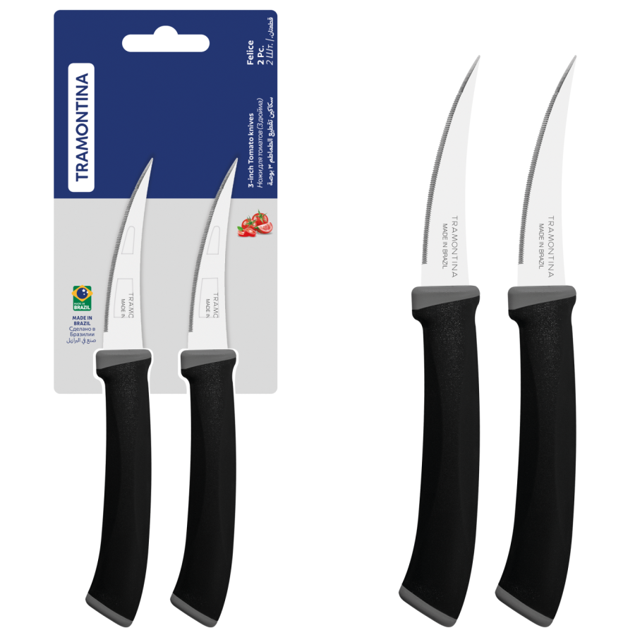 Ножі серії FELICE - ідеальні компаньйони у ваших щоденних кухонних справах. Високоякісна нержавіюча сталь леза, надійні та ергономічні поліпропіленові ручки, що витримують високі температури – ці властивості забезпечують довговічність використання, поєднану з винятковою силою розрізання харчових продуктів. Ручки представлені в класичних чорному та синьому кольорах. Ножі FELICE добре витримують миття в посудомийній машині. Вони створені, щоб максимально спростити вашу кухонну рутину!