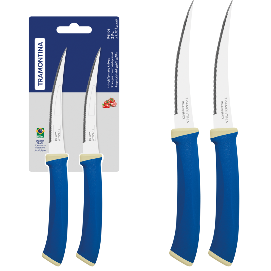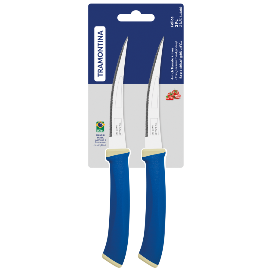 Ножі серії FELICE - ідеальні компаньйони у ваших щоденних кухонних справах. Високоякісна нержавіюча сталь леза, надійні та ергономічні поліпропіленові ручки, що витримують високі температури – ці властивості забезпечують довговічність використання, поєднану з винятковою силою розрізання харчових продуктів. Ручки представлені в класичних чорному та синьому кольорах. Ножі FELICE добре витримують миття в посудомийній машині. Вони створені, щоб максимально спростити вашу кухонну рутину!