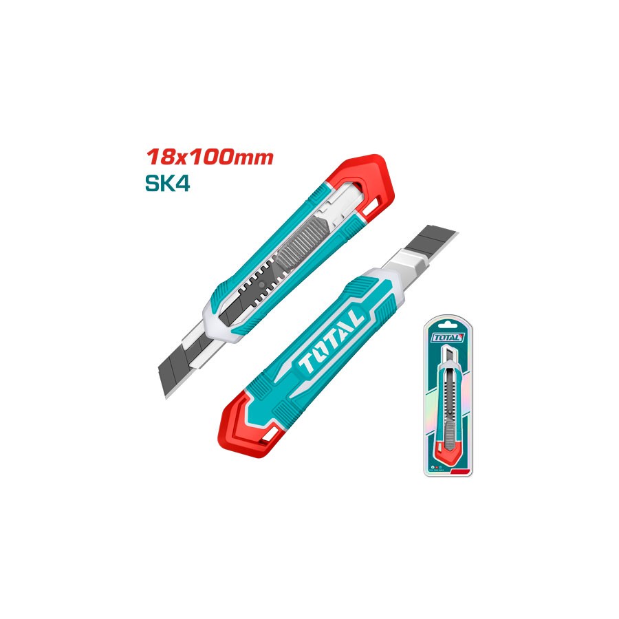 Ніж сегментний TOTAL THT511815 використовується при виконанні будівельних і господарських робіт для різання нетвердих матеріалів таких як папір, картон. Корпус ножа із пластику. Ніж має пластмасову кнопку фіксації леза та накладку проти ковзання в руці. Розмір леза - 18х100 мм. Довжина ножа - 179 мм.