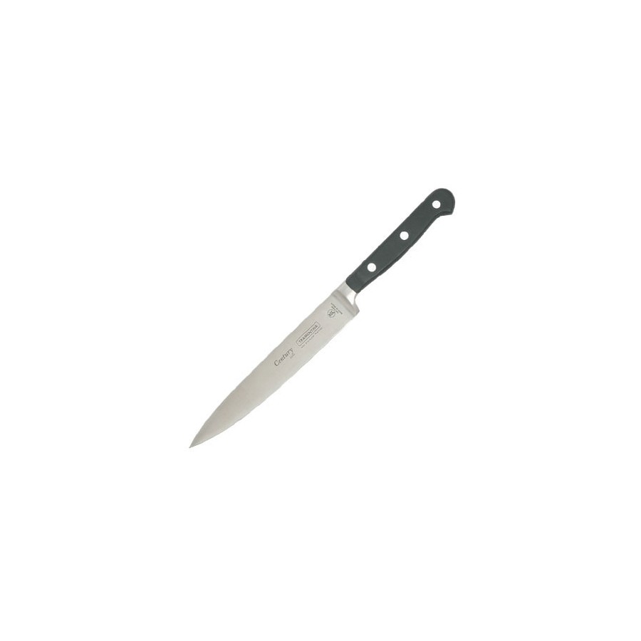 Ніж для тонкої нарізки Tramontina Century 24010/006 - мрія багатьох господинь і обов'язковий атрибут професійної кухні. Красиві рівні скибочки філе, витончена тонка шинка, сир рівними шматочками і багато іншого - все це доступно і просто, якщо у вас є спеціальний ніж для тонкої нарізки. Він відрізняється довгим, вузьким полотном з центральним вістрям. Ніяких зубчиків, тільки рівний гострий край і якісна сталь. Така форма і конструкція дозволяє уникнути прилипання до ножа шматочків. Ніж для тонкої нарізки дозволяє нарізати копчену рибу і варене м'ясо, акуратно зняти шкіру і вирішити безліч інших завдань.