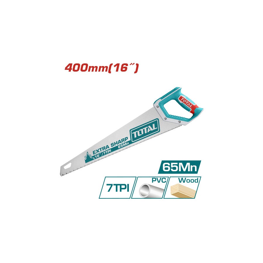 Ножівка TOTAL THT55400 - це надійний і ефективний інструмент для розпилювальних робіт по дереву з будь-яким рівнем складності. Завдяки використанню при виготовленні робочого полотна високоякісної сталі, дана пила служить довго та відмінно тримає заточку. Товщина полотна складає 0.9 мм, а його довжина - 400 мм. Показник кількості зубців на дюйм становить 7 шт, завдяки чому розпил виходить дуже акуратним. Двостороння заточка зубців значно підвищує ефективність роботи даною пилкою і дозволяє витрачати менше сил. Дана ножівка оснащена зручною прогумованою ручкою і отвором на кінці полотна для зручності підвішування інструменту в майстерні.