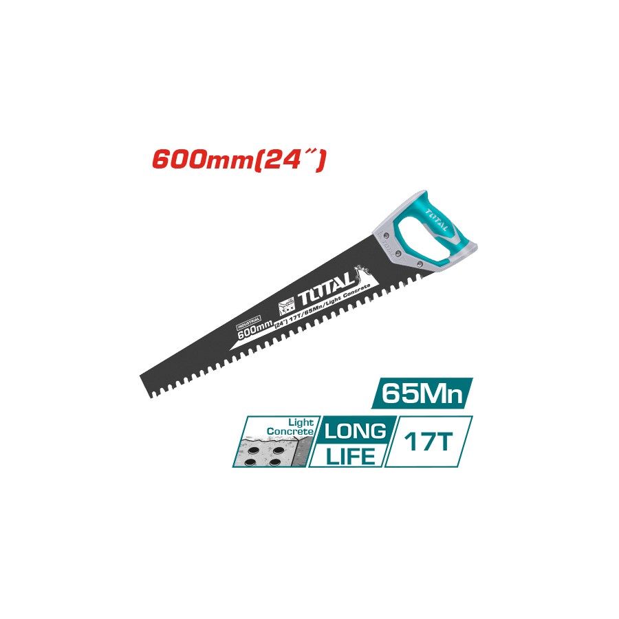 Ножівка для пінобетону TOTAL THTLCS1241 призначена для розпилювання блоків з газо- та пінобетону, гіпсокартону, цегли. Для збільшення ресурсу ножівки, у ній застосовані твердосплавні напайки з карбіду вольфраму. Показник кількості зубців на дюйм становить 17. Довжина ножівки 600 мм. Ручка виготовлена з двокомпонентного матеріалу, добре підходить для нижнього, середнього та високого хвату.