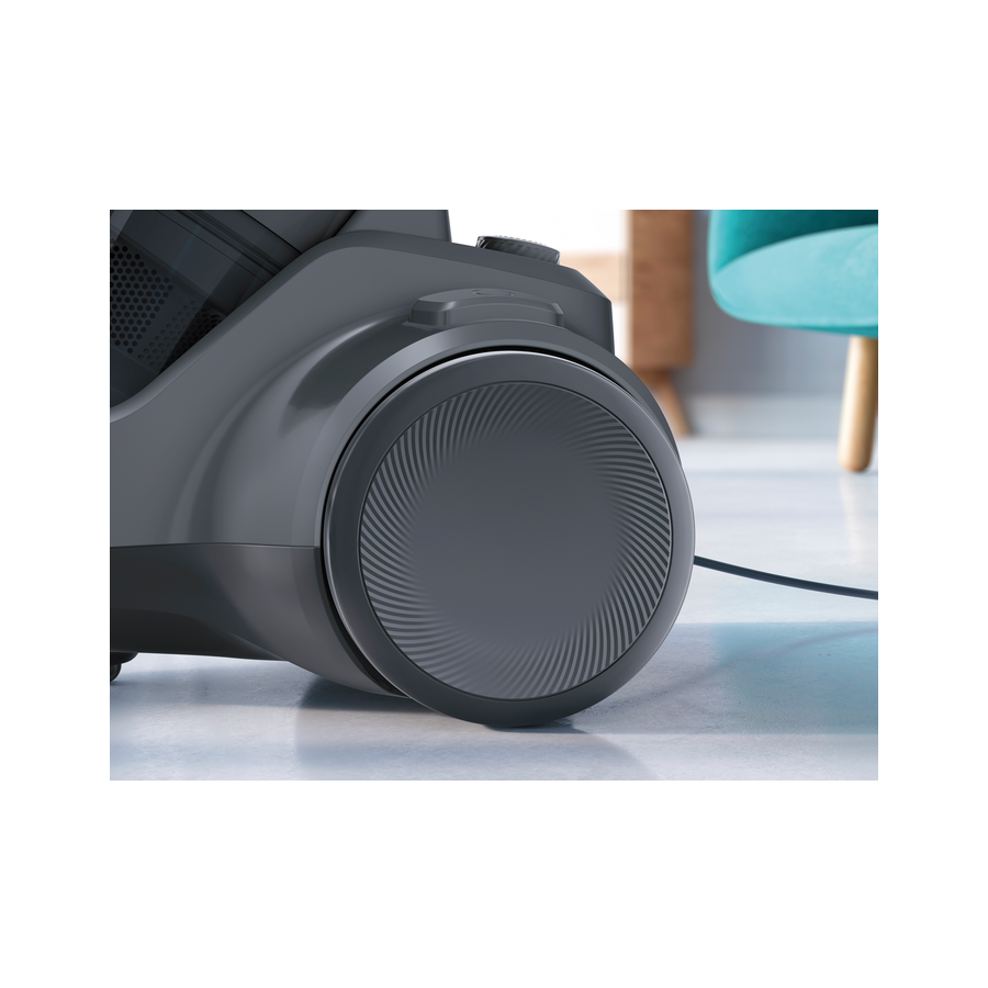 Великі поворотні колеса не допускають застрягання пилососа, покращуючи стійкість при переміщенні по дому.