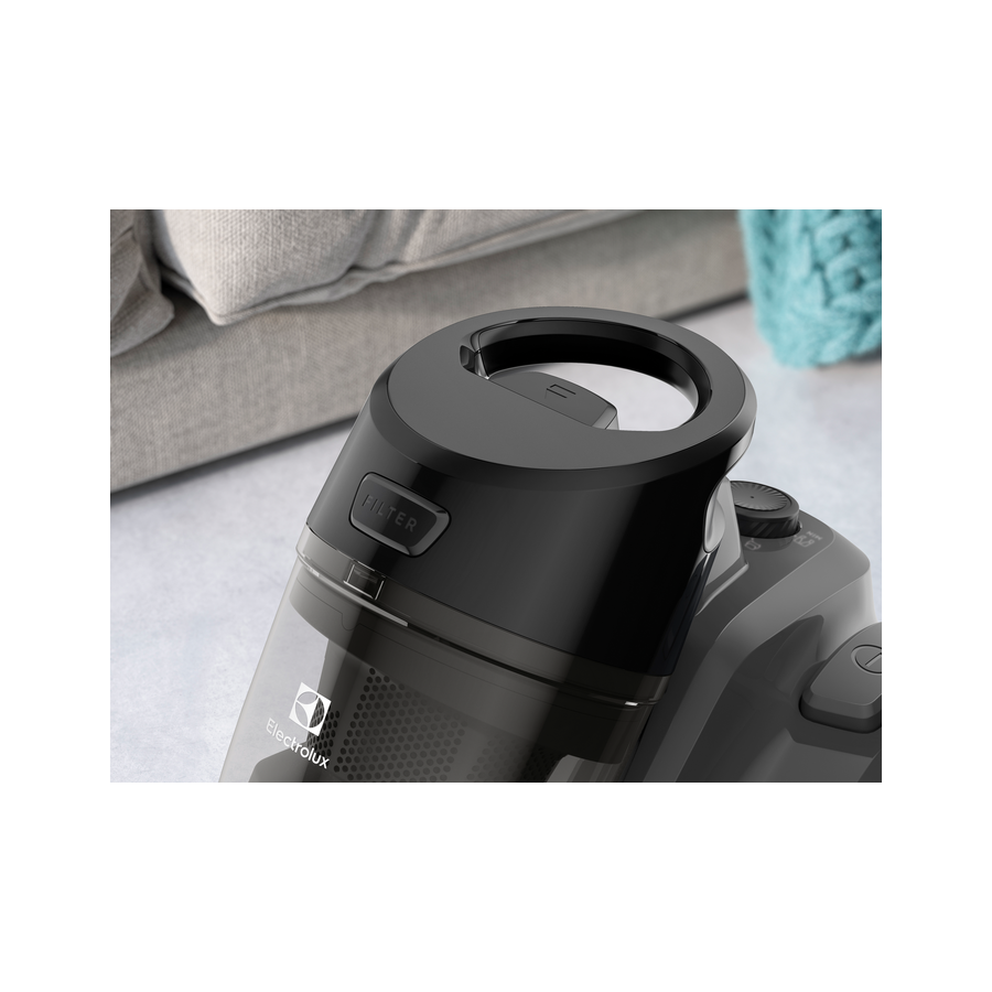 Контейнер відрізняється високою місткістю та утримує до 1,8 літрів, вимагаючи рідшого спорожнення. Одне натискання кнопки розблокування дозволяє акуратно та легко позбутися пилу.