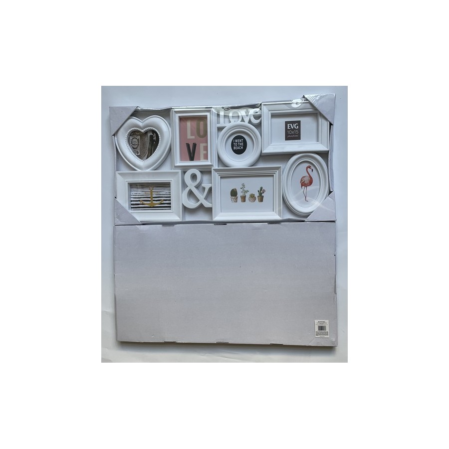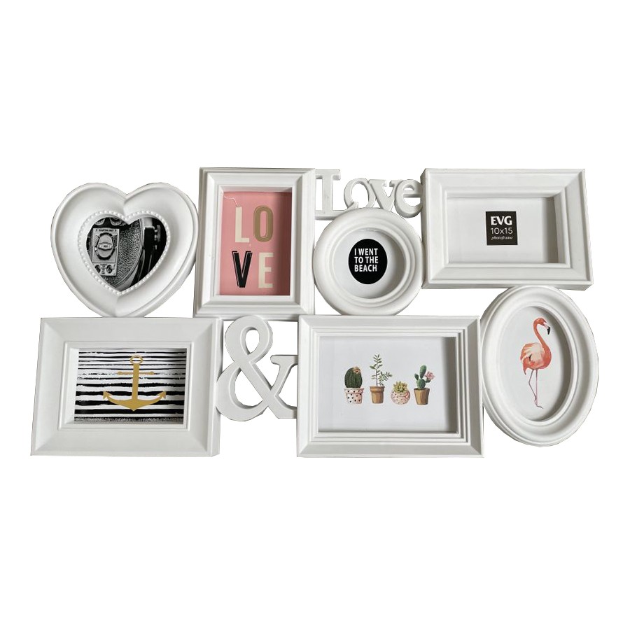 Мультирамка на 7 фото: 2 - 10х10 см, 4 - 10х15 см, 1 - 13х18 см. Матеріал - пластик, колір - білий. Загальний розмір 37 х 68 х 2 см.