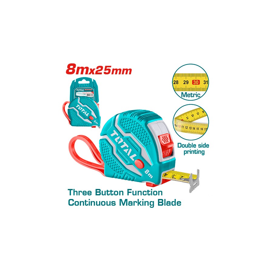 Рулетка TOTAL TMT126081M є незамінним інструментом для виконання будь-яких видів робіт, під час яких необхідно робити точні виміри відстаней від декількох десятків сантиметрів до кількох метрів. Прогумований корпус рулетки виконаний з міцного ABS-пластику й оснащений кліпсою, а також гумовим ремінцем на зап'ясток. Довжина та ширина вимірювального полотна складає 8м х 25 мм. Двостороннє нейлонове покриття оберігає полотно від забруднення, стирання та корозії. Подвійна кнопка фіксації дозволяє проводити вимірювання без сторонньої допомоги. Рулетка також має кнопку зупинки полотна.