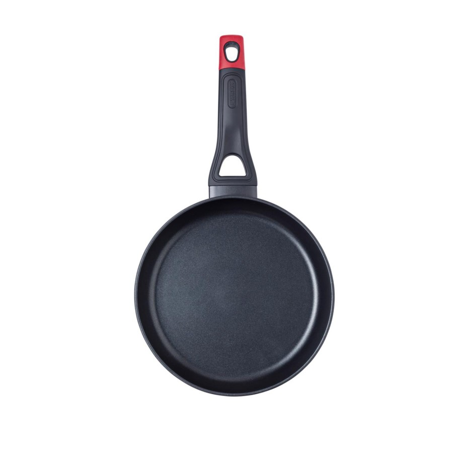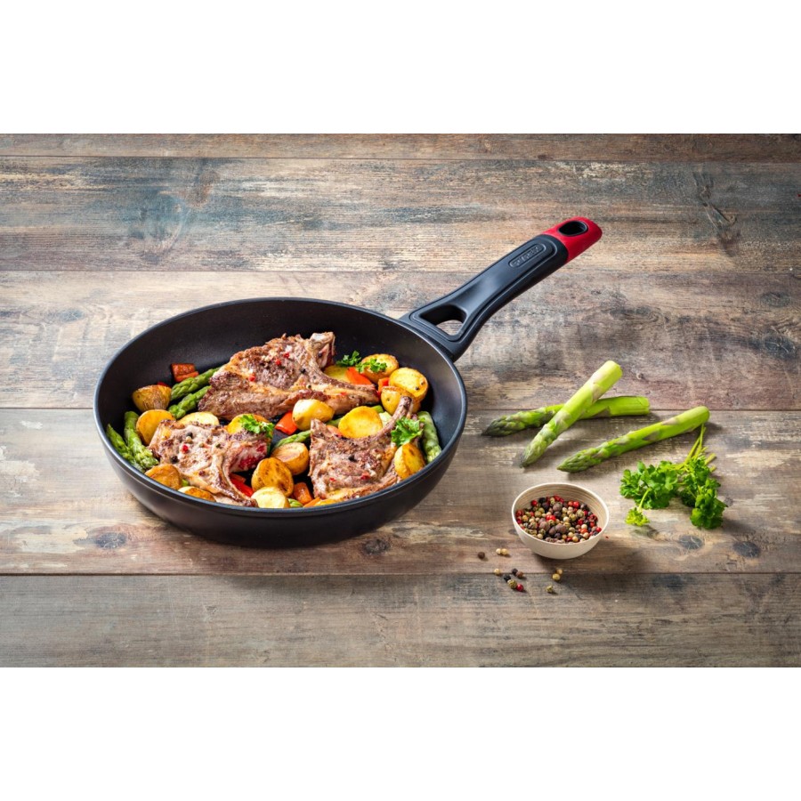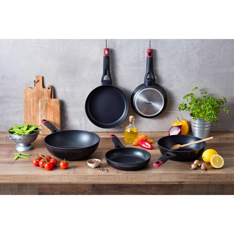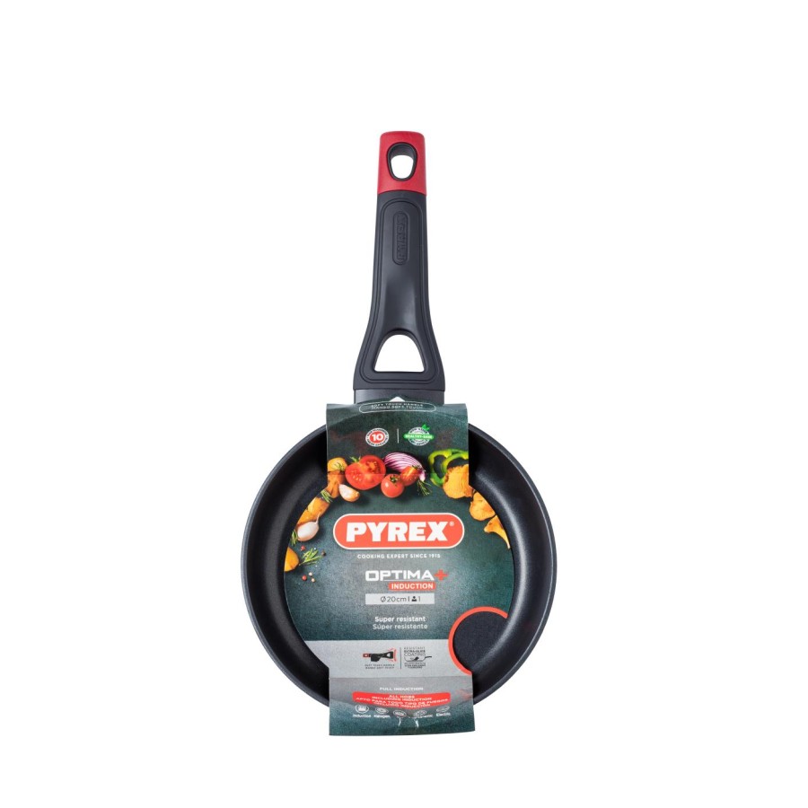Pyrex представляє нову серію Optima+: посуд з кованого алюмінію, з міцним антипригарним покриттям Whitford Xylan+ і ексклюзивною ручкою у формі літери Y, що забезпечує безпечне та комфортне використання завдяки своїй ергономічній широкій формі з упором для великого пальця і оздобленням soft touch, а силіконова вставка червоного кольору служить яскравим і стильним акцентом.