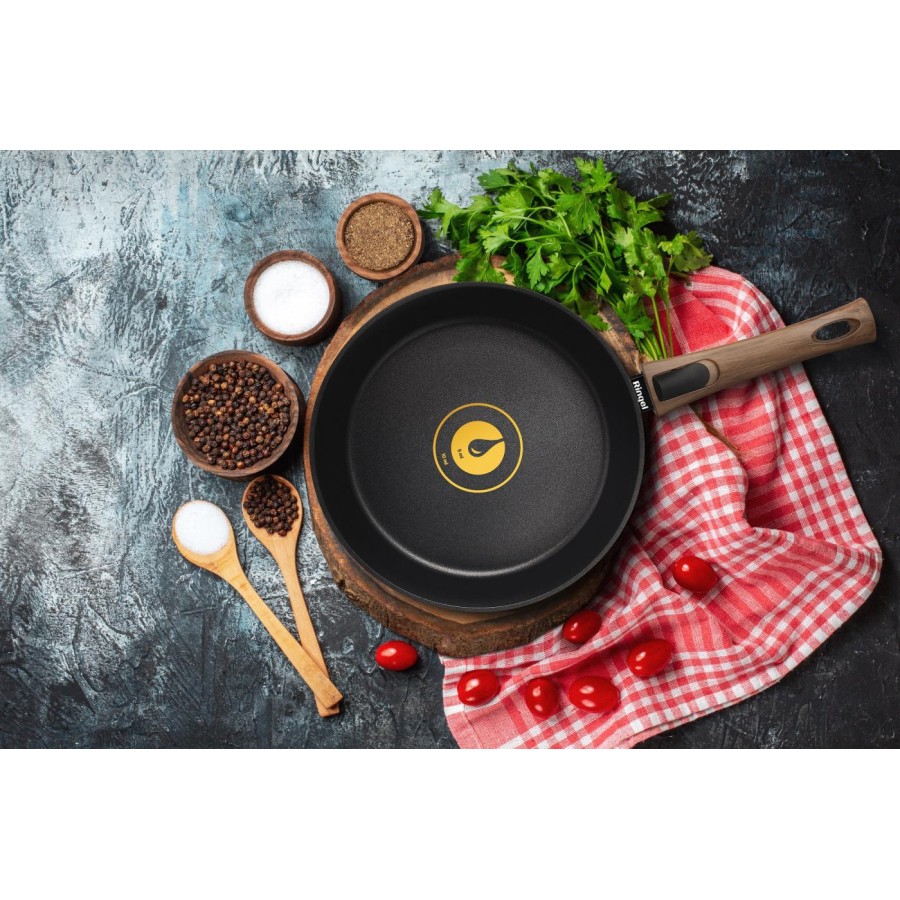 Зручність використання даної сковороди досягається завдяки ергономічній знімній ручці з бакеліту. Додаткове покриття soft-touch, крім тактильного задоволення, захищає руки від опіків і дозволяє не вислизає навіть з вологих долонь. Додаткова яскрава вставка підкреслює дизайн сковороди. Також, завдяки знімній ручці цю сковороду можна використовувати у духовій шафі.