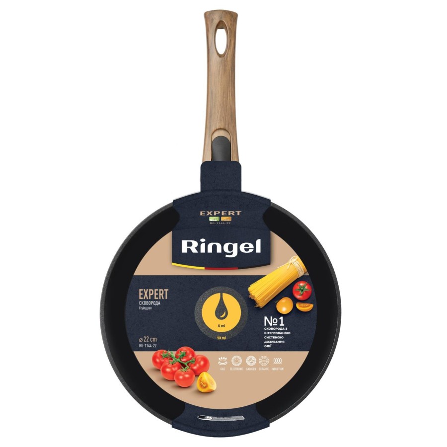 У кожну сковороду RINGEL інтегрована перша у світі система дозування олії. Найменша поділка системи відповідає 5 мл олії, а більша – 10 мл олії. За допомогою цієї системи ви зможете легко та швидко приготувати водночас здорові та смачні страви з використання мінімуму жиру та з максимальним збереженням корисних речовин у страві.