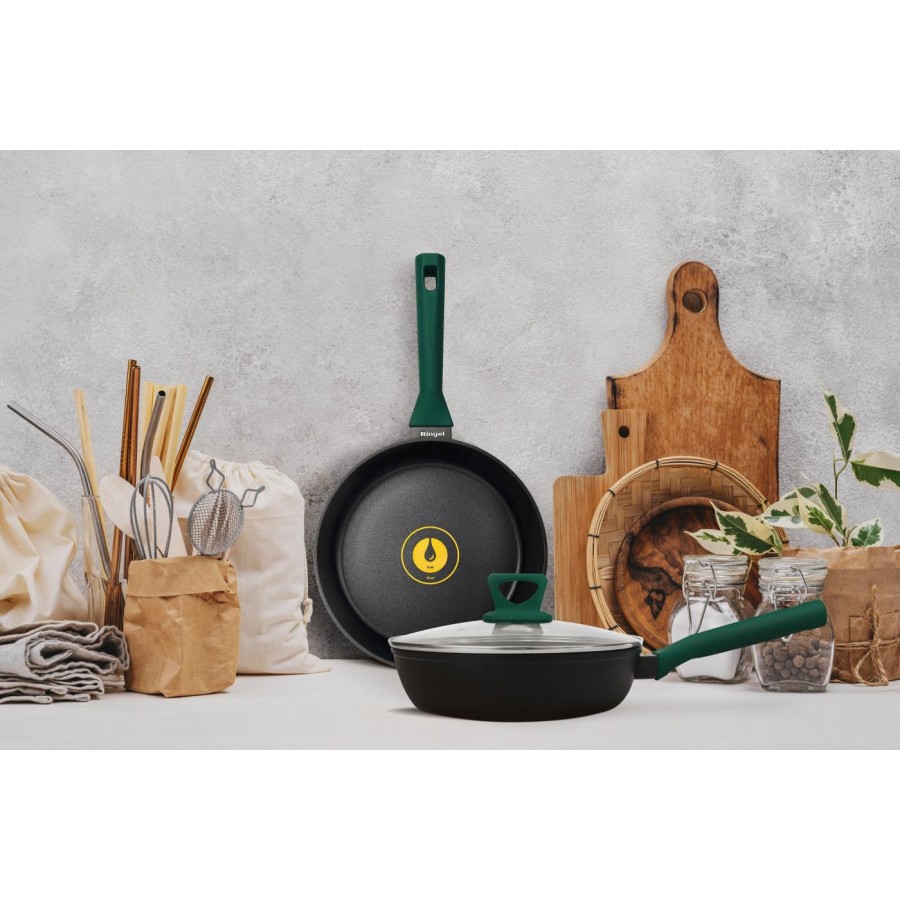 Серія сковорідок Herbal від Ringel - це відмінний варіант як для приготування страв з соусів, самих соусів і тушкування, завдяки високим бортикам, так і прекрасний посуд для розігрівання. Виготовлені з високоякісного кованого алюмінію, дані сковороди є міцним посудом зі швидким і рівномірним нагріванням. Дно сковорідок цієї серії має додаткове потовщення до 4 мм, порівняно зі стінками у 3 мм. У даній серії використовується надстійке тришарове антипригарне покриття, що дозволяє використовувати менше олії при приготуванні