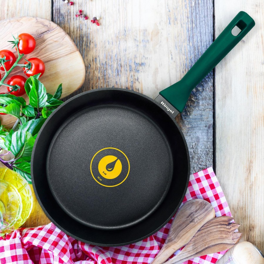 У кожну сковороду RINGEL інтегрована перша у світі система дозування олії. Найменша поділка системи відповідає 5 мл олії, а більша – 10 мл олії. За допомогою цієї системи ви зможете легко та швидко приготувати водночас здорові та смачні страви з використання мінімуму жиру та з максимальним збереженням корисних речовин у страві.