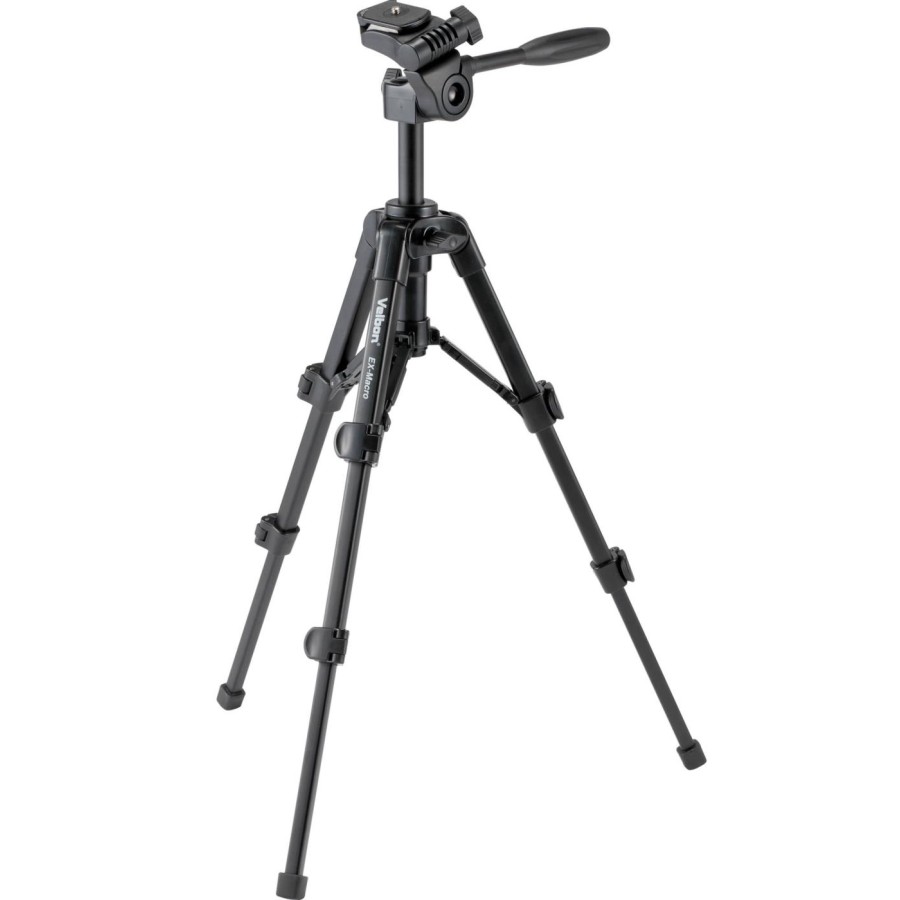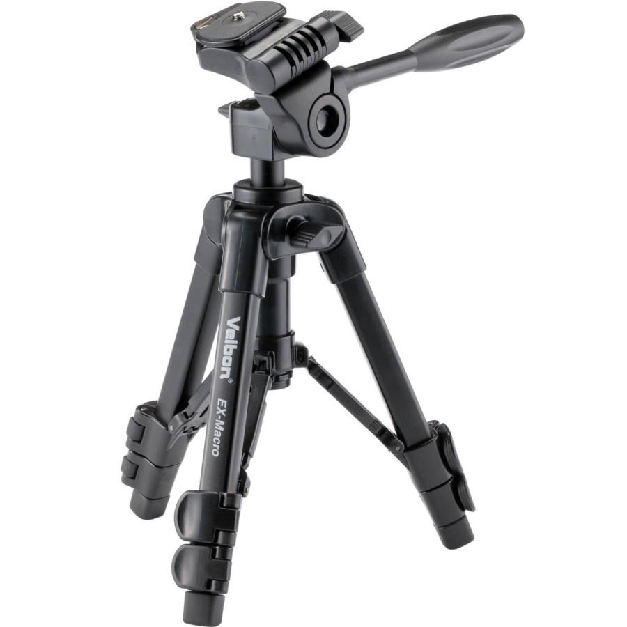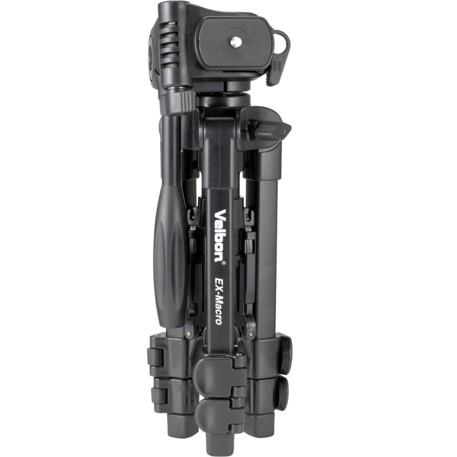 Velbon EX-Macro є легким алюмінієвим штативом для початківців і просунутих користувачів, у комплекті з панорамною рідинною відеоголовкою зі швидкознімним майданчиком і кріпленнями QB-32. Платформа камера обертається до 90 градусів праворуч, що дозволяє робити портретну зйомку. Максимальна робоча висота при повністю висунутій центральній колоні 56.3 см, мінімальна - 20.3 см. Трисекційна конструкція опорних колон штатива забезпечує максимальну жорсткість і стійкість, а нижні прогумовані частини колон забезпечують хорошу стійкість на будь-якій поверхні. EX-Macro витримує максимальне навантаження 2.5 кг, діаметр верхньої секції колони 20 мм. У комплект входить кейс для перенесення.
