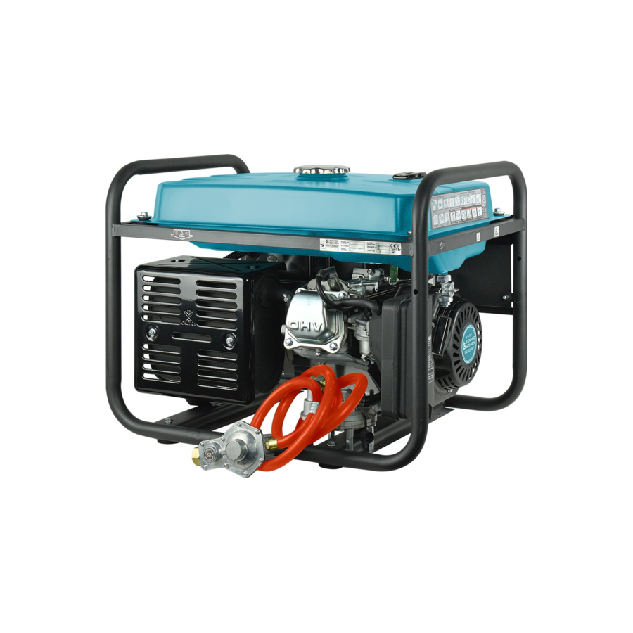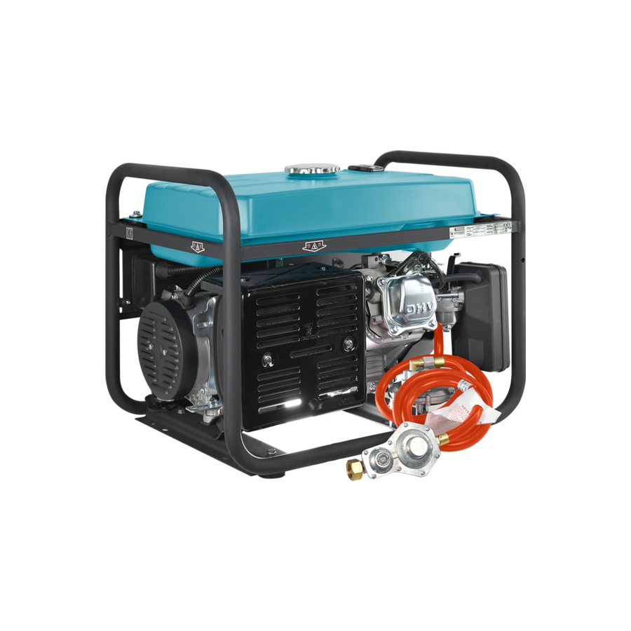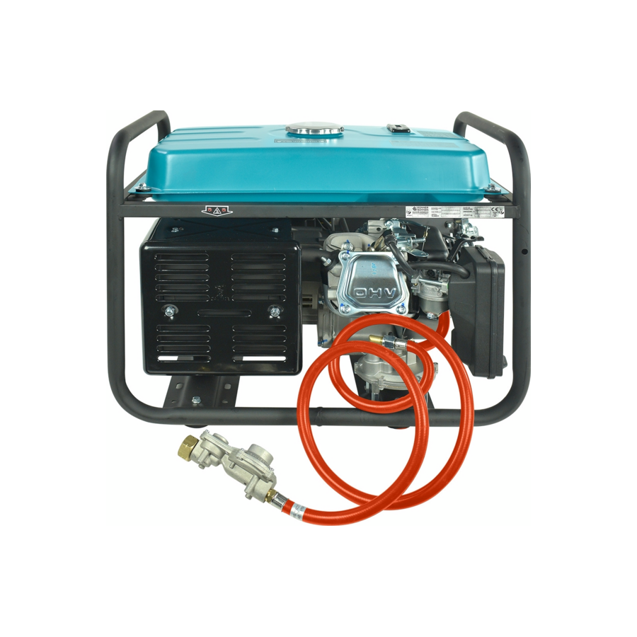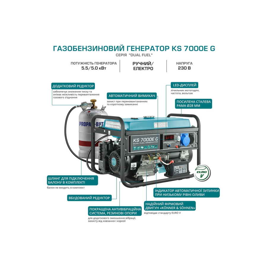 Експлуатація генератора на газі підвищує моторесурс двигуна. Все необхідне для під'єднання балона входить до комплекту: генератор обладнаний двома редукторами та шлангом під'єднання; необхідно тільки приєднати генератор до балона. Генератор не призначений для під'єднання до газової магістралі. У разі потреби газобензинові моделі легко перемкнутися на роботу на бензині. Потужний одноциліндровий 4-тактний двигун K&S з повітряним охолодженням забезпечує стабільну та надійну роботу генератора.